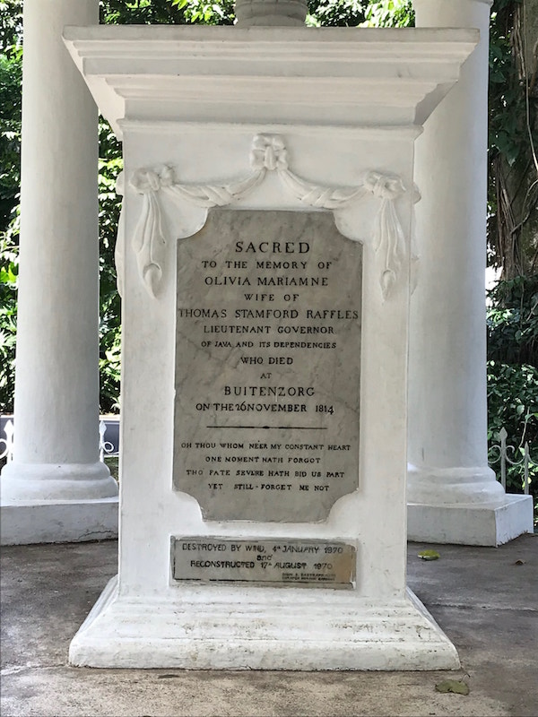 A while ago I visited the botanic gardens in Bogor, Indonesia, with a group of friends. At one point we came across a monument that Raffles (the founder of modern Singapore) had built upon the death of his beloved wife Olivia, while he was Lieutenant Governor of British Java.